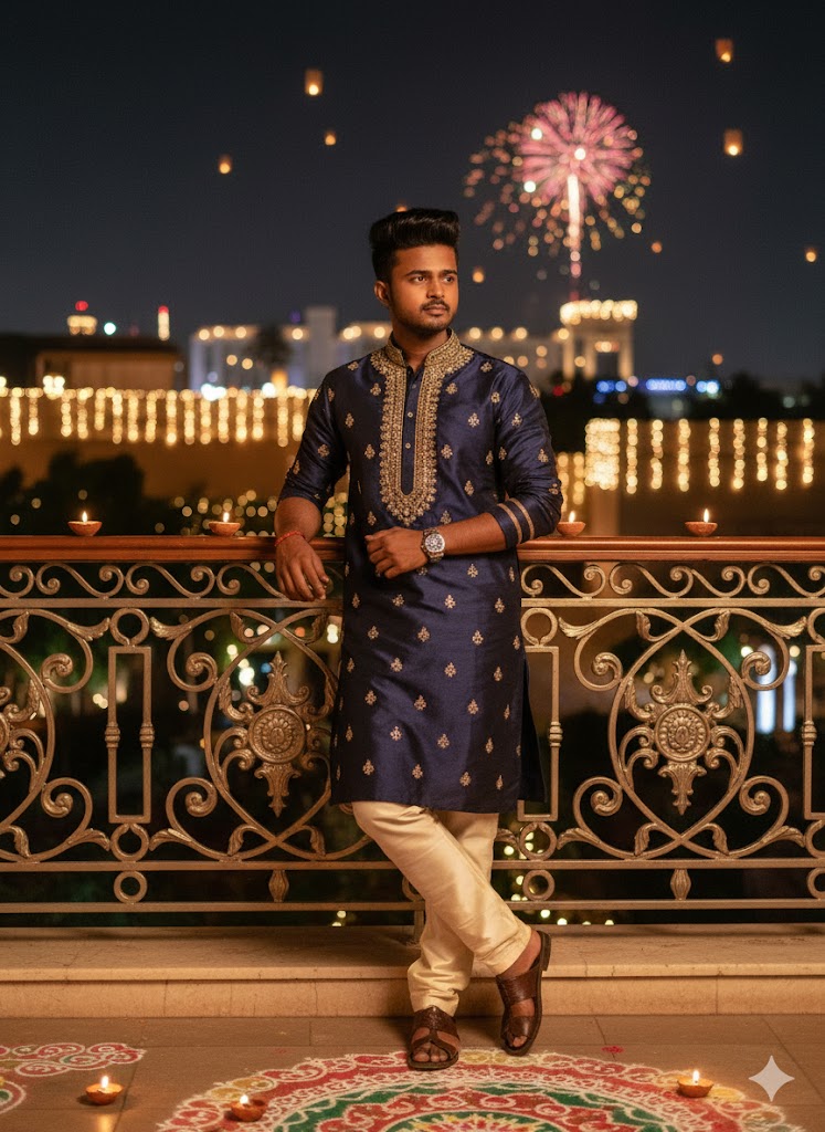 Meanwhile, ultra hyper-realistic, eye-level full-body vertical portrait of a handsome young man leaning casually on a terrace railing outside a bungalow.One hand rests on the railing, the other hand near his pocket, relaxed cinematic vibe. Wearing luxurious embroidered designer kurta, tailored Patiala pyjama, premium leather sandals. Face and perfectly styled hairstyle exactly as in uploaded reference. Luxury wristwatch sparkles, bold armband tattoo visible. Nighttime Diwali scene with glowing diyas, floating lanterns, fairy lights, vibrant rangoli, and distant fireworks. Soft warm reflections on surroundings, shallow depth of field, creamy cinematic bokeh, rich warm film-style color grading, ultra-HD 8K, luxury fashion photoshoot aesthetic.