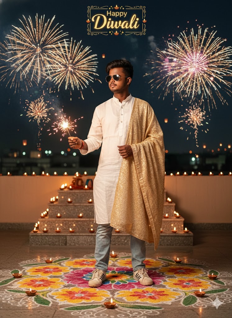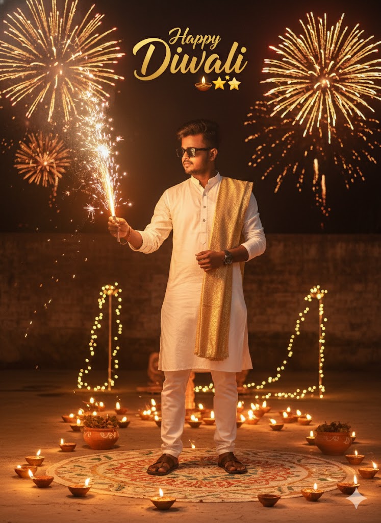 “Hyper-realistic 8K full-body portrait of a stylish young man celebrating Diwali. He wears a white kurta with a shining golden dupatta or jacket, giving a timeless and elegant festive look. He lights sparkling fireworks surrounded by glowing lamps. Black sunglasses, festive vibe. Background: ‘Happy Diwali’ written in a stylish font with festive emojis. Additionally, use the uploaded reference image for the exact face and hairstyle, with ultra-detailed, cinematic warm lighting, and a dynamic festive composition.