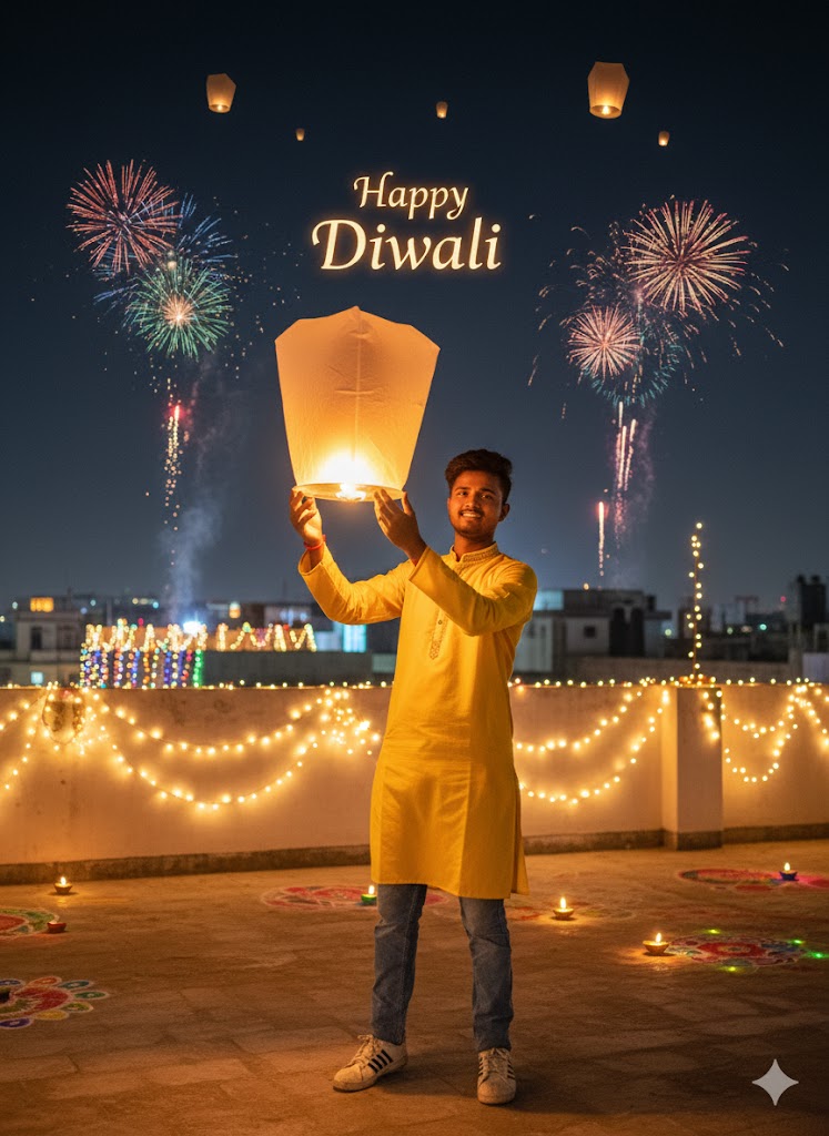Create a Diwali photo of a boy celebrating Diwali on the rooftop of his house at night. The rooftop is already decorated with lights. He is wearing a bright yellow kurta. The boy is holding a sky lantern. He is holding it with both hands and flying it into the sky. He is standing straight and looking straight at the camera. There are already some sky lanterns in the sky along with Diwali crackers. The text “Happy Diwali” is also written in the sky. The boy’s face should be exactly as in the photo we uploaded. There is joy of Diwali all around. Make the photo half, so only the kurta should be visible.
