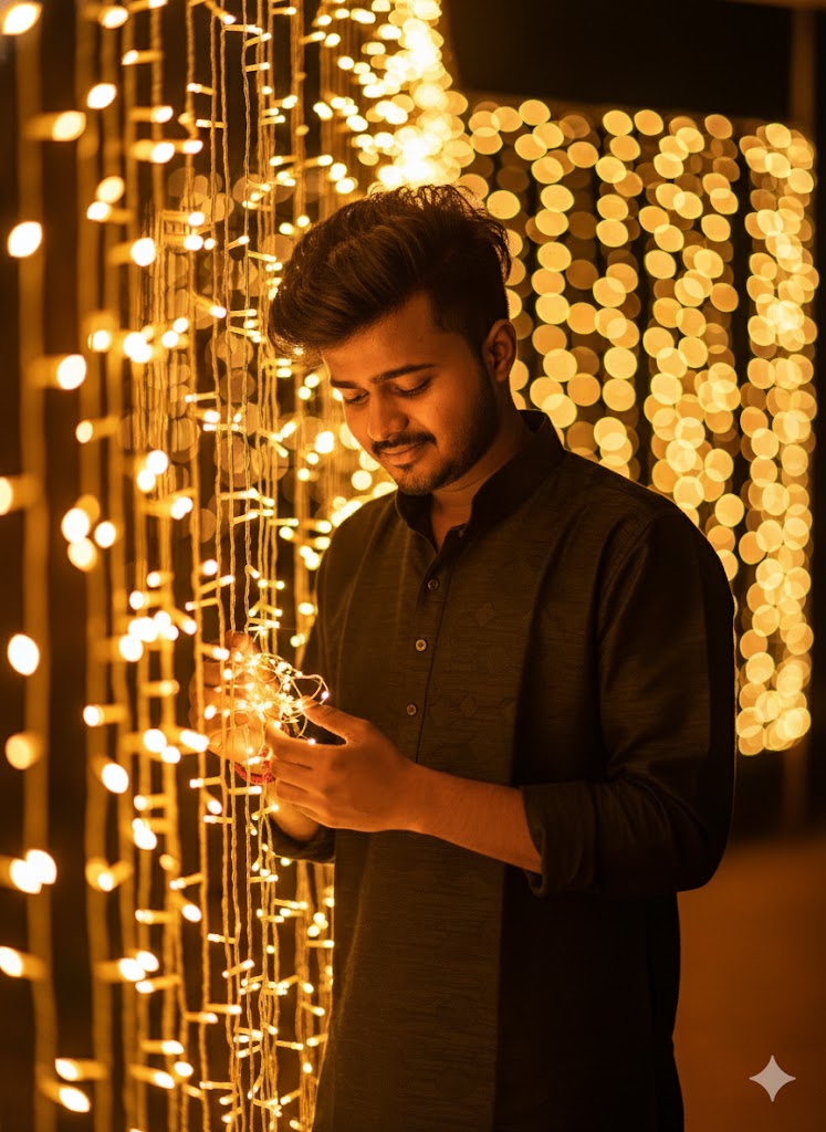 A young man in a stylish black kurta with rich texture, standing close to glowing golden fairy lights, lightly holding the string with both hands. His body is turned slightly towards the lights while his face is gently looking down with a soft smile, creating a calm and graceful vibe. The camera is positioned slightly above eye-level, giving a cinematic portrait feel with perfect depth of field. Warm golden fairy lights form dreamy bokeh circles in the background, illuminating his face with a soft glow. His hair is voluminous and neatly styled, beard sharp and well-trimmed, adding charm to his expression. Ultra photorealistic, 4K hyper-detailed, cinematic lighting, festive atmosphere, professional DSLR portrait photography.”