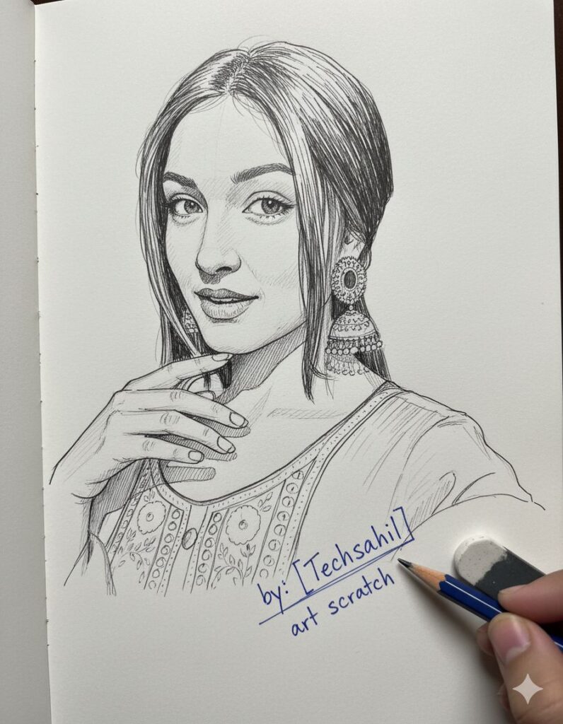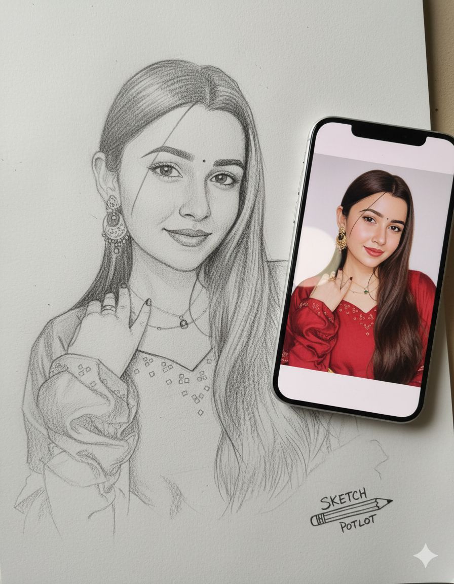 Create an ultra-detailed, hyper-realistic 3D-style graphite pencil sketch of a human face, drawn on textured white notebook paper with visible paper grain and subtle imperfections. The face sketch should look exactly like the reference photo shown on an iPhone placed next to the notebook. The iPhone’s screen clearly displays the original portrait photo that the artist is drawing, with natural reflections and soft daylight glare on the glass. signature sketch connected with potlot written” by: [Editing Bank] with art scratch.