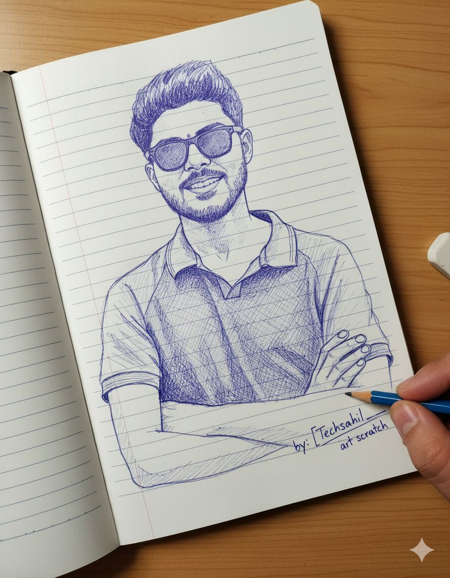 make a photo style drawing line sketch ink blue and white about a face (details of the face exactly the same as in the uploaded object), intricate details, normal background note book page and right finger holding pen and eraser, signature sketch connected with potlot written" by: [Editing Bank] with art scratch.