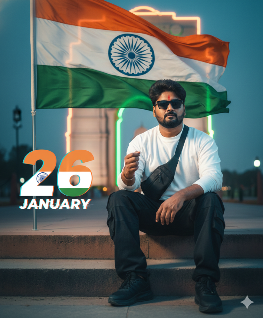 Create an ultra-realistic, modern patriotic 8K cinematic portrait using the uploaded image as a strict face lock, ensuring the subject’s face remains 100% unchanged and instantly recognizable, with no reshaping, enhancement, beautification, or AI alteration, preserving natural skin texture and real human detail. The Indian boy is sitting casually on a concrete step, holding the Indian tricolor flag flowing behind him in the wind, wearing a white oversized long-sleeve T-shirt, black cargo pants, black sneakers, and a sling bag, with a voluminous hairstyle, black sunglasses, and confidently holding the Indian flag. The background features India Gate rendered as a subtle neon-lit holographic overlay, set in cinematic dusk lighting with a shallow depth of field, captured in crisp 8K DSLR-quality realism with professional color grading. Add bold patriotic typography with a large graphic “26” in tricolor styling and “JANUARY” in glitch-blur typography, blended naturally into the scene for a modern Republic Day aesthetic, maintaining a clean, editorial, ultra-realistic look with a strong contemporary patriotic mood.