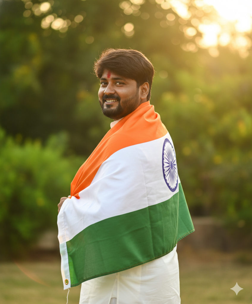 Create a vibrant, high-resolution patriotic portrait of a joyful young man celebrating Indian pride, gracefully wrapped in the Indian national tricolor with the Ashoka Chakra clearly visible, dressed in a traditional white kurta-pajama that reflects purity and elegance. He is smiling warmly while glancing back over his shoulder, capturing a natural moment of happiness, freedom, and pride. The background features soft greenery and warm, golden lighting, creating a festive, uplifting, and emotionally rich patriotic atmosphere, with natural colors, crisp detail, and a lively celebratory mood that feels authentic, timeless, and deeply connected to the spirit of India.