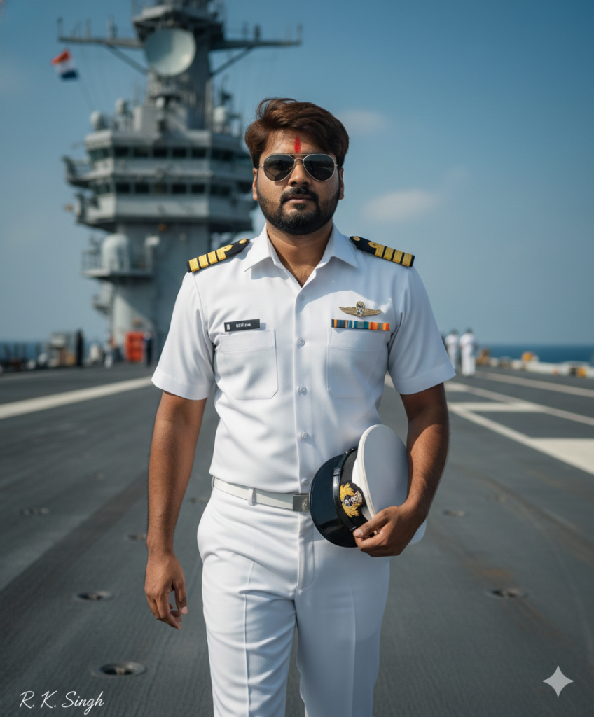 Create an ultra-realistic, cinematic portrait using the uploaded reference photo as a strict face lock, ensuring the subject’s face remains 100% identical with no reshaping, beautification, smoothing, or AI alteration, preserving natural skin texture and real human detail. The subject is a handsome young Indian man (around 25 years old) wearing a crisp Indian Navy officer uniform with a clean white shirt, visible shoulder stripes, official badges, and white trousers, walking confidently along an aircraft carrier deck. He holds his white naval cap in one hand, wears black aviator sunglasses, and has neatly styled brown hair, projecting a heroic, disciplined, and commanding presence. Use cinematic yet realistic lighting with balanced highlights and shadows, professional DSLR-style focus, shallow depth of field, and authentic naval textures to enhance realism and authority. Add” at the bottom-left corner in a small handwritten signature-style cursive font with thin strokes, subtle premium elegance, and white or soft off-white color. Negative prompt: cartoon, anime, CGI, illustration, AI-generated face, any face change, blur, low resolution, over-smoothed skin, or any watermark other than the signature.