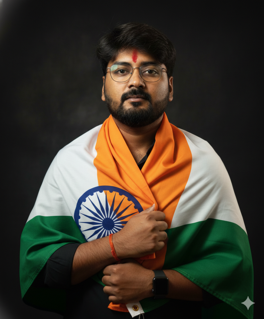 A PROUD YOUNG INDIAN MAN STANDING AGAINST A DARK BACKGROUND, WRAPPED IN THE INDIAN NATIONAL FLAG (TRICOLOR WITH SAFFRON, WHITE, AND GREEN), HOLDING IT CLOSE TO HIS CHEST WITH ONE HAND. HE HAS SHORT, NEATLY STYLED HAIR, A TRIMMED BEARD, AND IS WEARING GLASSES AND A SMARTWATCH. THE ASHOKA CHAKRA ON THE WHITE STRIPE IS CLEARLY VISIBLE. THE LIGHTING IS DRAMATIC AND FOCUSED ON HIS FACE, CREATING A BOLD, PATRIOTIC, AND EMOTIONAL ATMOSPHERE.
