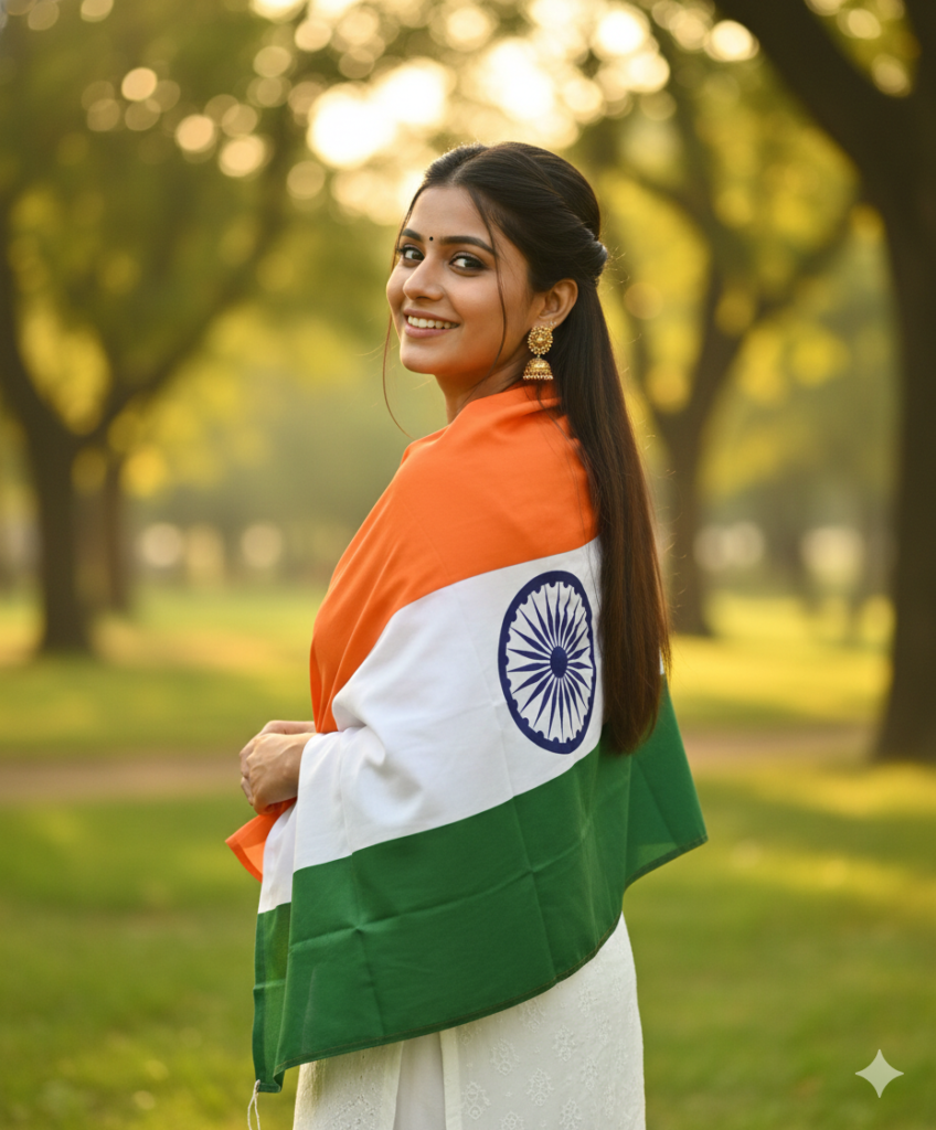 “Create a hyper-realistic, cinematic outdoor portrait of a cheerful young Indian woman standing in a lush green park, using the uploaded reference image strictly to preserve her facial identity, structure, and expression without any alteration. She is wrapped in the Indian national flag (Tiranga) around her shoulders like a shawl, with the orange section resting across her upper body, the white band in the center displaying the Ashoka Chakra clearly, and the green section flowing downward naturally. Beneath the flag, she wears a simple white ethnic outfit for a clean, elegant look. Her long, straight dark hair is styled half-up, with soft, natural strands framing her face. She smiles brightly while looking back over her shoulder toward the camera, conveying warmth, pride, and peaceful patriotism. Add a small black bindi, subtle natural makeup, and traditional jhumka earrings for a cultural touch. Set the background as a softly blurred park scene with warm sunlight filtering through trees, creating a smooth bokeh effect. Use warm, natural tones, gentle highlights, shallow depth of field, ultra-sharp 8K DSLR-style detail, and premium color grading to deliver a vibrant, emotionally rich, photorealistic finish.”